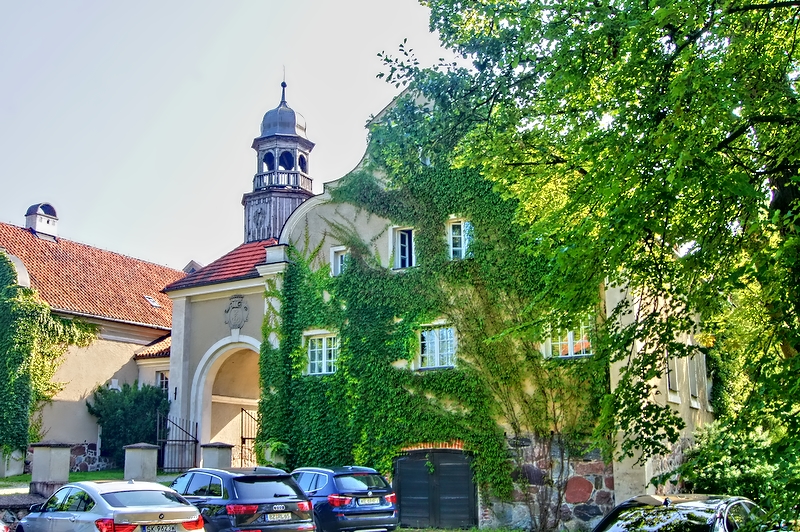 W majątku znajduje się również stary spichlerz. Dobudowany w 1745 roku tuż przed bramą wjazdową go głównego kompleksu pałacowego. Założony jest na planie prostokąta o czterospadowym dachu i dwóch kondygnacjach. Wzniesiony techniką szachulcową o bardzo widocznych belkach, typowych dla konstrukcji tzw. muru pruskiego.[...]