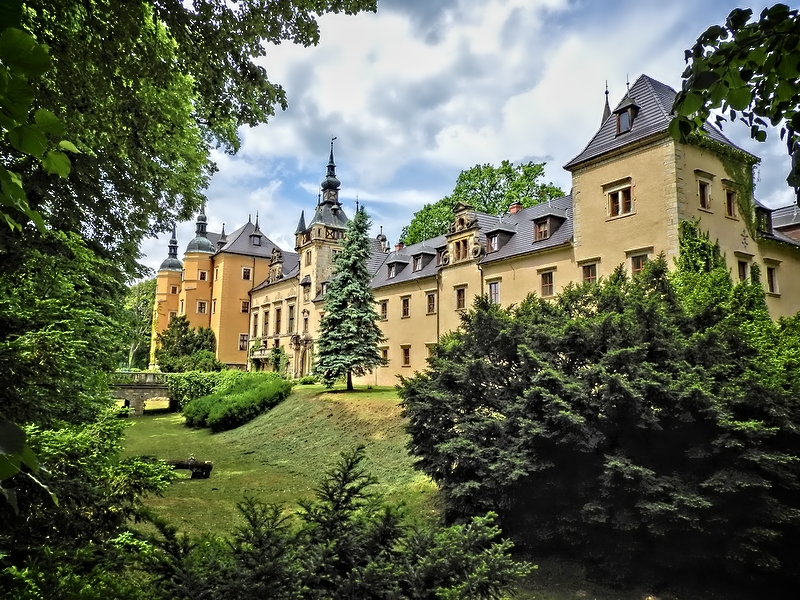 Obecnie zamek wznosi się na skraju wsi, na leśnym terenie, na wschodnim brzegu rzeki Kwisy. Pierwotnie warownia najprawdopodobniej była obiektem nawodnym. Założenie zostało ufundowane w końcu XIII wieku przez księcia świdnicko-jaworskiego Bolka I. Pierwsza wzmianka wymieniająca obiekt jako castrum Clieczchdorf lub Cliczchdorff pochodzi z 1291 roku. Po śmierci Bolka I zamek pozostawał w posiadaniu wdowy po nim, księżnej Agnieszki. Po jej śmierci stanowił własność prywatną i należał kolejno do: Kittlitzów, Zedlitzów. Na lata 1391-1631 przypada okres władania zamkiem rodziny Rechenbergów. Na drugą połowę XVI wieku przypada przebudowa zamku na renesansowy pałac. Na lata 1631-1703 przypada okres władania pałacem hrabiowskiego rodu Schellendorfów. Po nich pałac przeszedł w posiadanie Frankenbergów, którzy w roku 1728 ufundowali dla pałacu nową kaplicę. Od nich rezydencję przejął Seyfried von Promnitz. W roku 1764 posiadłość została przejęta przez hr. Solm- Tecklenburga z Baruth. Spadkobiercy tego ostatniego byli właścicielami pałacu aż do zakończenia II Wojny Światowej. Budowla właśnie im zawdzięcza rozbudowę w duchu eklektycznym mającą swój czas między 1881 a 1883 rokiem. Po zakończeniu działań wojennych w pałacu ulokowano różne instytucje państwowe co niestety sprzyjało jego dewastacji. Stan zabytku pogorszył się znacznie po pożarze w 1948 roku. W latach 70 tych XX wieku całe założenie zostało przejęte przez Politechnikę Wrocławską celem wykorzystania go jako ośrodek konferencyjno-wypoczynkowy. Niestety prace adaptacyjno-remontowe zostały zaniechane w 1982 roku. W latach 90 tych obiekt został zakupiony przez prywatnego właściciela.