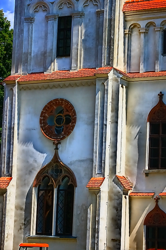 Bardzo ciekawie prezentuje się ściana południowo - zachodnia. Przylega do niej parterowa przybudówka, nad którą znajduje się taras i loggia zwieńczona attyką. Arkady są profilowane, ostrołukowe, wsparte na filarach. Rozciąga się stąd piękny widok na przylegający park, w którym rośnie wiele starych i zabytkowych drzew. Naroże tejże ściany zdobi okrągła baszta, zwężająca się nieznacznie ku górze.